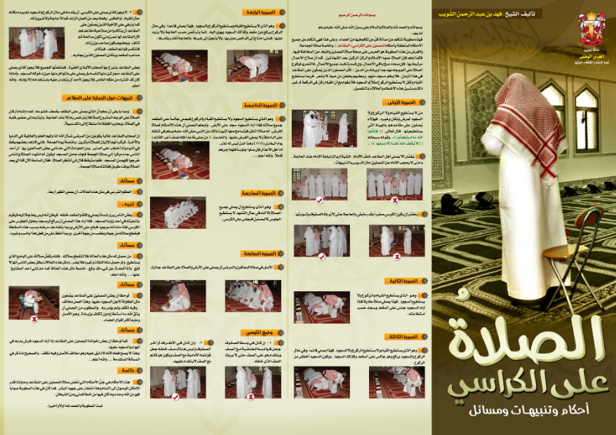 بوستر متميز يبين الأحكام المتعلقة بأحكام المُصلِّين على الكراسي، خاصةً صلاة الجماعة.