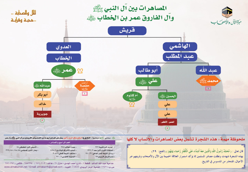 بوستر يحتوي على رسم توضيحي يبين بعض المصاهرات بين آل النبي - صلى الله عليه وسلم - وآل الفاروق عمر بن الخطاب - رضي الله عنه -، وتبين شجرة المصاهرة أن العلاقة بينهم كانت قبل وبعد الفتنة، مما يؤكد استمرار العلاقة الحميمة بين الآل والأصحاب وذريتهم عبر الأجيال.