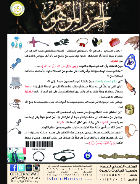 بوستر يبين أن العزائم والتولة والخرزات التي اعتمد عليها أصحاب القلوب المريضة والنفوس الضعيفة إنما لا تزيدهم إلا وهنا وضعفا، لا تنفع ولا تضر ولا تغني عنهم شيئا.