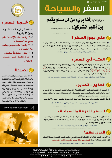 بوستر يبين بعض محاذير السفر إلى بلاد الكفار، مع بيان شروط ذلك السفر.