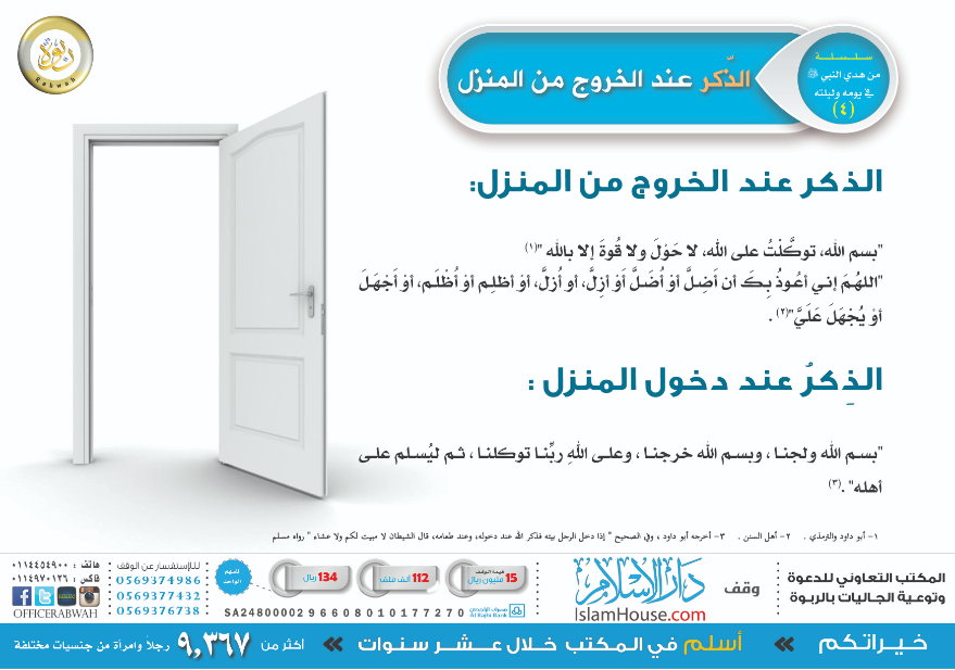 بوستر متميز من إعداد مكتب جاليات الربوة يحتوى على أذكار الخروج من المنزل وعند دخوله.