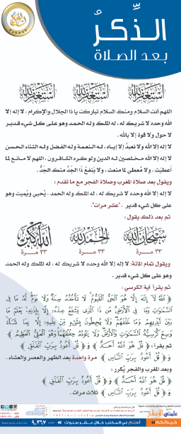 أذكار بعد الصلاة : عدة بوسترات متميزة تحتوي على الأذكار المأثورة بعد الصلاة، يمكن تصفحها مباشرة دون تحميل، وتناسب أيضًا الجوال.