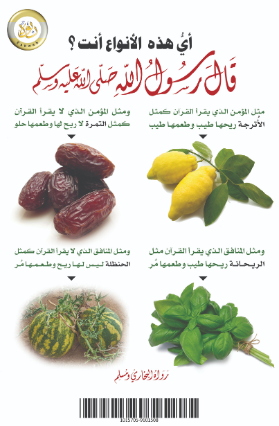 مَثَلُ الْمُؤْمِنِ الَّذِي يَقْرَأُ الْقُرْآنَ كَمَثَلِ الْأُتْرُجَّةِ رِيحُهَا طَيِّبٌ وَطَعْمُهَا طَيِّبٌ، وَمَثَلُ الْمُؤْمِنِ الَّذِي لَا يَقْرَأُ الْقُرْآنَ كَمَثَلِ التَّمْرَةِ لَا رِيحَ لَهَا وَطَعْمُهَا حُلْوٌ، وَمَثَلُ الْمُنَافِقِ الَّذِي يَقْرَأُ الْقُرْآنَ مَثَلُ الرَّيْحَانَةِ رِيحُهَا طَيِّبٌ وَطَعْمُهَا مُرٌّ، وَمَثَلُ الْمُنَافِقِ الَّذِي لَا يَقْرَأُ الْقُرْآنَ كَمَثَلِ الْحَنْظَلَةِ لَيْسَ لَهَا رِيحٌ وَطَعْمُهَا مُرٌّ.