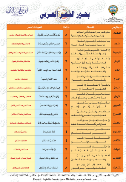 بحور الشعر العربي : بوستر من إصدار مجلة الوعي الإسلامي، يحتوي على جدول مصور مختصر ببحور الشعر العربي وأوزانه، وعدد تفعيلات كل بحر، وأمثلة عليه.