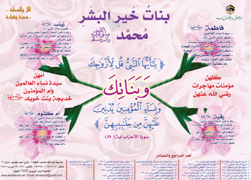 بوستر يحتوي على أسماء بنات النبي - صلى الله عليه وسلم -، وأوقات ولادتهن ووفاتهن، وبيان مكانتهن، وأسماء أزواجهن وأبنائهن - رضي الله عنهم أجمعين -.