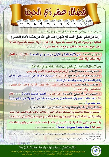بوستر اشتمل على بعض فضائل عشر ذي الحجة، وبعض الأعمال الصالحة التي ينبغي القيام بها في أيام العشر.