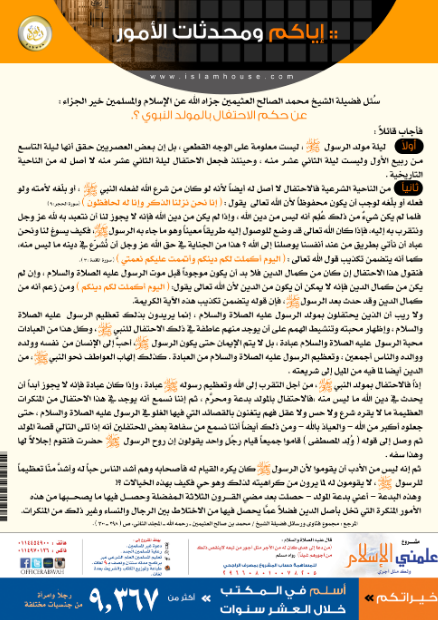 بوستر يحتوي على فتوى للشيخ ابن عثيمين - رحمه الله بين فيها حكم الاحتفال بالمولد النبوي.