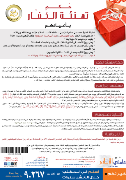 بوستر يحتوي على سؤال أجاب عنه الشيخ ابن عثيمين - رحمه الله - ونصه: «ما حكم تهنئة الكفار بعيد الكريسمس وعيد رأس السنة الميلادية؛ وذلك لأنهم يعملون معنا؟ وكيف نرد عليهم إذا حيونا به؟ وهل يجوز الذهاب إلى أماكن الحفلات التي يقيمونها بهذه المناسبة؟ وهل يأثم الإنسان إذا فعل شيئا مما ذكر بغير قصد، وإنما فعله إما مجاملة أو حياء أو إحراجا أو غير ذلك من الأسباب ؟ وهل يجوز التشبه بهم في ذلك؟».