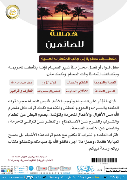 بوستر متميز يحتوي على مقالة للشيخ ابن جبرين - رحمه الله - تضمنت تنبيهات على أخطاء أو نقائص تقع من بعض الصائمين.
