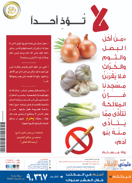 "من أكل البصل والثوم والكراث فلا يقربن مسجدنا؛ فإن الملائكة تتأذى مما يتأذى منه بنو آدم".