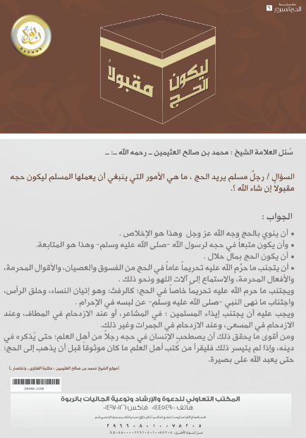 بوستر يحتوي على سؤال أجاب عنه الشيخ ابن عثيمين - رحمه الله - ونصه: «رجل مسلم يريد الحج؛ ما هي الأمور التي ينبغي أن يعملها المسلم ليكون حجه مقبولاً».
