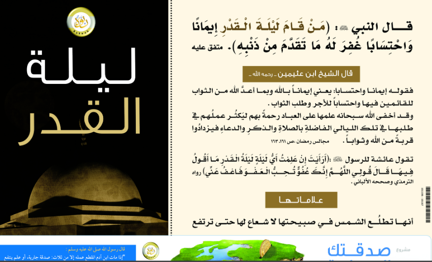 «مَنْ قَامَ لَيْلَةَ الْقَدْرِ إِيمَانًا وَاحْتِسَابًا غُفِرَ لَهُ مَا تَقَدَّمَ مِنْ ذَنْبِهِ».