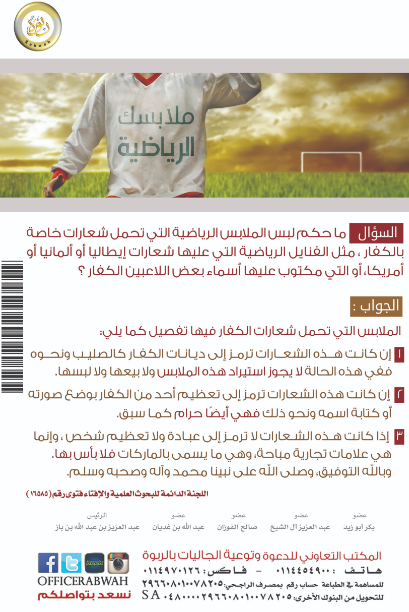 بوستر يحتوي على سؤال أجابت عنه اللجنة الدائمة للبحوث العلمية والإفتاء، ونصه: «ما حكم لبس الملابس الرياضية التي تحمل شعارات خاصة بالكفار، مثل: الفنايل الرياضية التي عليها شعارات إيطاليا، أو ألمانيا، أو أمريكا، أو التي مكتوب عليها أسماء بعض اللاعبين الكفار؟».