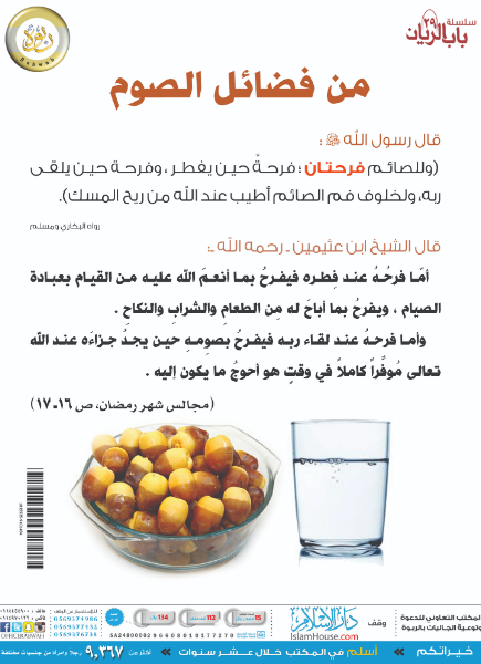 "وللصائم فرحتان: فرحه حين يفطر، وفرحة حين يلقى ربه، ولخلوف فم الصائم أطيب عند الله من ريح المسك".