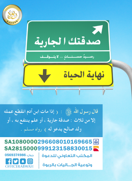 مشروع صدقتك الجارية: مشروع تابع للمكتب التعاوني للدعوة وتوعية الجاليات بالربوة، يهدف إلى المساهمة إلى عمل صدقة جارية لتكون عونًا للعبد على مرضاة الله - عز وجل -.