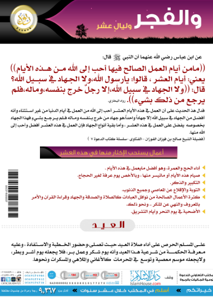 "مَا مِنْ أَيَّامٍ الْعَمَلُ الصَّالِحُ فِيهَا أَحَبُّ إِلَى اللَّهِ مِنْ هَذِهِ الأَيَّامِ، [يَعْنِى أَيَّامَ الْعَشْرِ]. قَالُوا يَا رَسُولَ اللَّهِ: وَلاَ الْجِهَادُ في سَبِيلِ اللَّهِ؟ قَالَ: وَلاَ الْجِهَادُ في سَبِيلِ اللَّهِ، إِلاَّ رَجُلٌ خَرَجَ بِنَفْسِهِ وَمَالِهِ فَلَمْ يَرْجِعْ مِنْ ذَلِكَ بِشَيءٍ".