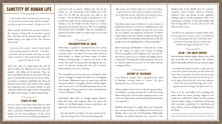 This pamphlet shows the attitude of Islam towards terrorism. It contains some Islamic Texts which refer to the morals of Muslims in the war, the mercy of Islam to animals and the prohibition of murder.