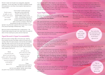 This pamphlet talks about women’s right in Islam such as equal right to knowledge and equal right to choose a spouse. It also shows that the principle of reward and accountability is equal for man and woman in Islam.